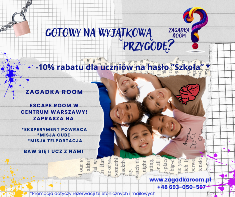 Przy rezerwacji telefonicznej i mailowej na hasło: „Szkoła” uczniowie otrzymają od nas 10% rabatu od ceny regularnej. Promocja dostępna przy rezerwacji telefonicznej i mailowej do końca września.
